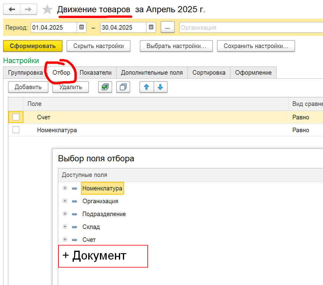 И добавить в него новый Отбор с возможностью выбора (+) соответствующих полей из Документа.