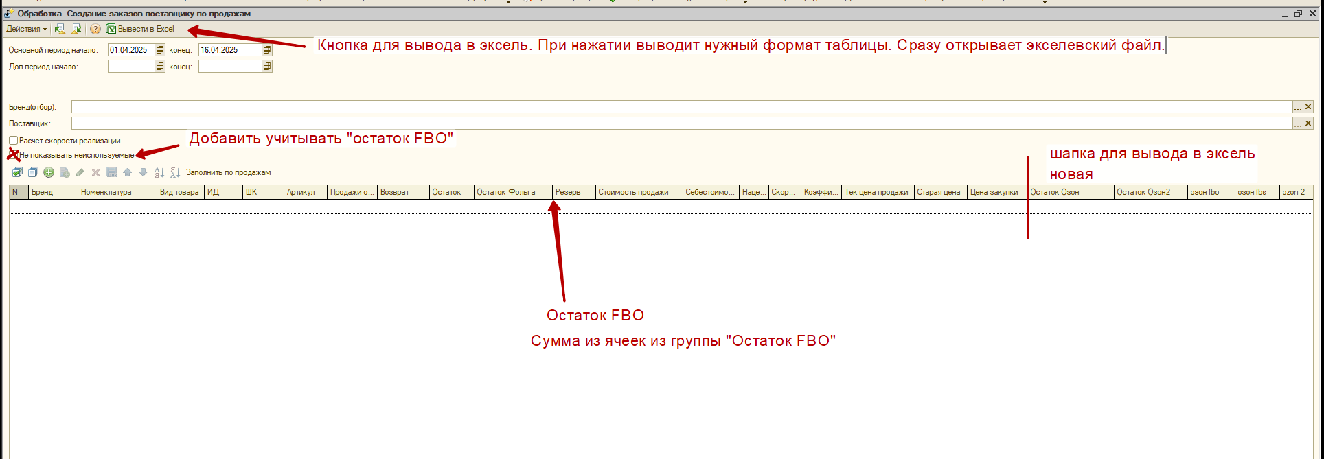 Есть обработка, выводящая за период список номенклатуры с разными данными, касающимися её (цены, остатки на разных складах, продажи в разных каналах). У нас добавилось несколько новых каналов и складов - надо туда их дописать. Вся логика написана и работает, нужно добавить к старым, работающим каналам, новые. Также необходимо улучшить формат выведения таблицы и добавить столбец с новым остатком. На скриншотах написал подробности.