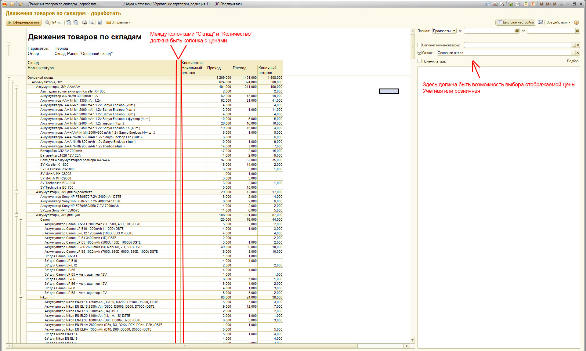 Требуется доработка отчёта: "Движения товаров по складам" с выгрузкой результатов в сводную таблицу. Конфигурация 1С 8.2 Управление торговлей 11.1
