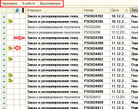 1. В верху списка сделать три вкладки: "Черновик" (тут лежат непроведенные заказы), "В работе" (тут лежат проведенные заказы), "Выполненные" (заказы по которым отгружены все товары или сделана корректировка, т.е. сняты с резерва все позиции);