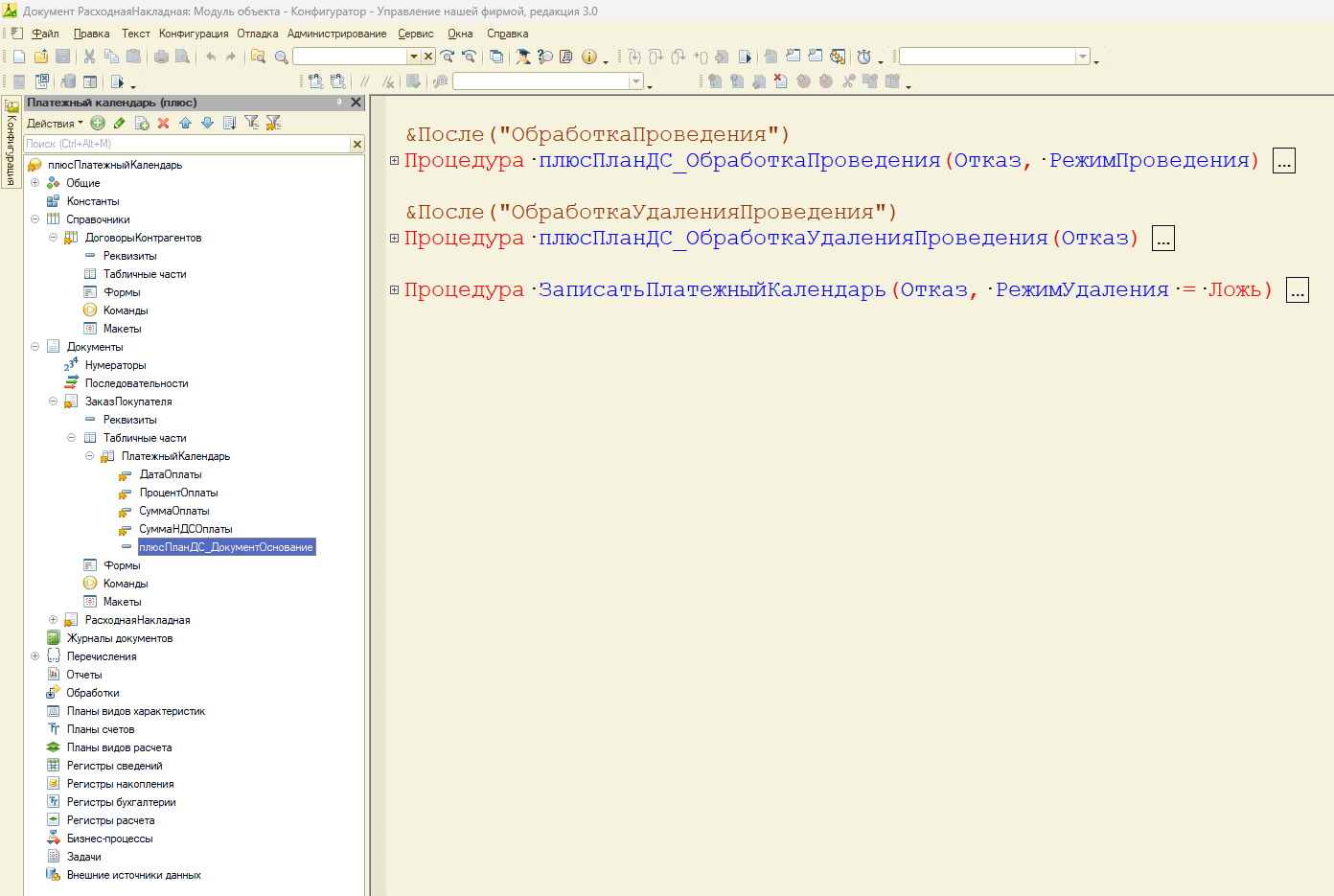 Для 1С:УНФ 3.0 написать процедуру и регламентное задание, которое ежедневно будет анализировать все незавершенные заказы покупателя и планировать поступление денег путем записи в табличную часть ПлатежныйКалендарь документа ЗаказПокупателя. Реализовать в рамках расширения, которое уже имеется (пересечения с ним минимальные, см. скриншот).