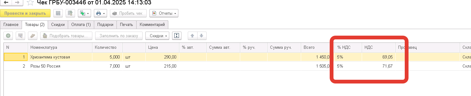 Месяц пробивались чеки по двум организациям без НДС, а должны были с 5%. В Целом в базах 1с поправили везде этот момент, вот кроме документов "Чек ККМ"(а он оказывается участвует в обмене с УТ для формирования ОтчОРознПродаже ОтчОРознВозвратах). В общем нужно во всех чеках по отбору(организация и дата интервал) поменять на НДС 5%, НО есть один нюанс, я пробовал групповой обработкой поменять НДС на 5%, но "сумма НДС" в строке товара пустая остаётся всё равно. Прилагаю 2 скриншота, один чек нормальный, второй вот косячный БЕЗ НДС.