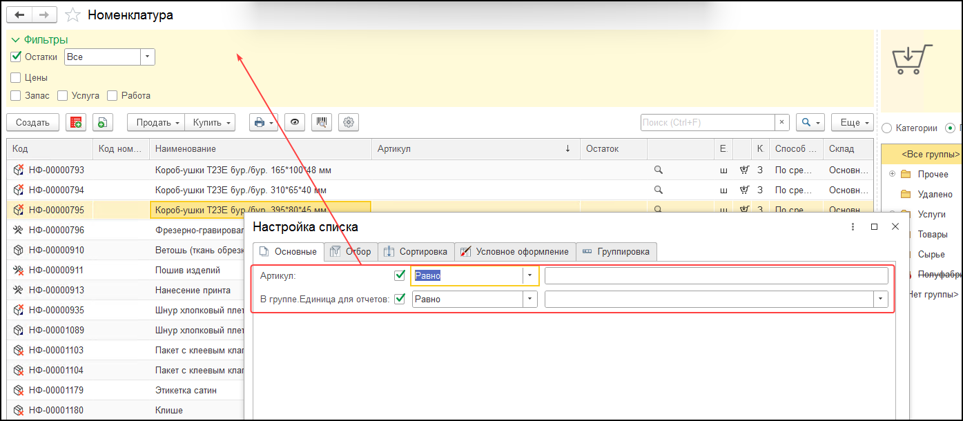 В УНФ есть типовые "Фильтры" (Остатки, Цены, Тип).