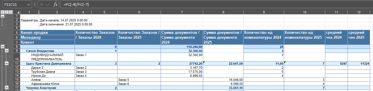 2) Средний чек заполняется в группировке Менеджер и равен сумме документов за прошлый период деленный на количество Клиентов