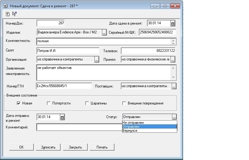 Готов к сотрудничеству. Только есть один вопрос, необходимо ли видеть цепочку "Товар1 отправлен документом №1" - "Товар1 возвращен документом №2". Если, да, то предлагаю сделать в документе со статусом "Вернулся" привязку к документу отправки в ремонт.