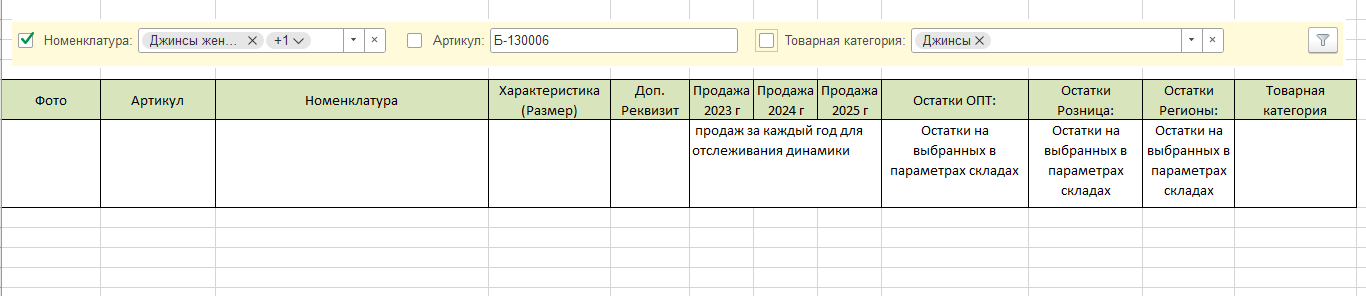 В шапке необходимо вывести отборы по списку номенклатуры, Артикул содержит, реквизиту Товарная категория. В параметрах необходимо реализовать фильтры для выборки складов.
