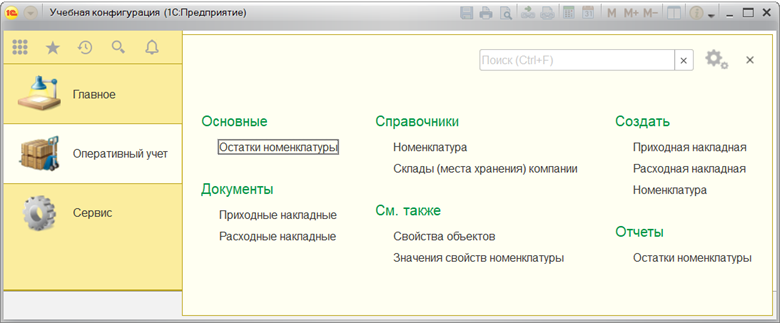 Необходимо создать интерфейс для решения учебной задачи. В интерфейсе должны быть созданы три раздела: «Главное», «Оперативный учёт», «Сервис». Панель навигации вместе с панелью действий на вкладке «Оперативный учёт» должна обеспечивать доступ ко всем объектам раздела, которые используются при решении конкретной учебной задачи, в том числе к регистрам.