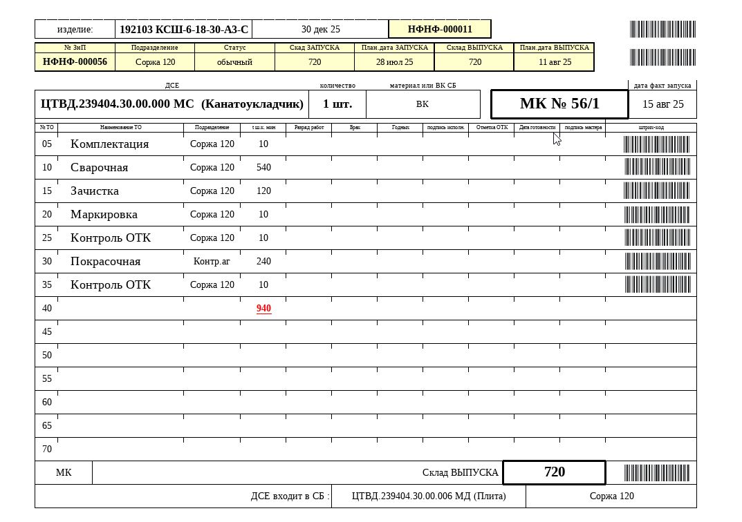 Разработать печатную форму маршрутной карты из заказа на производство. Исполнить задание в форме внешнего отчёта на базе конфигурации УНФ 3.0.11.169. Шаблон прилагается. Подробное описание заполнения полей вышлем дополнительно.