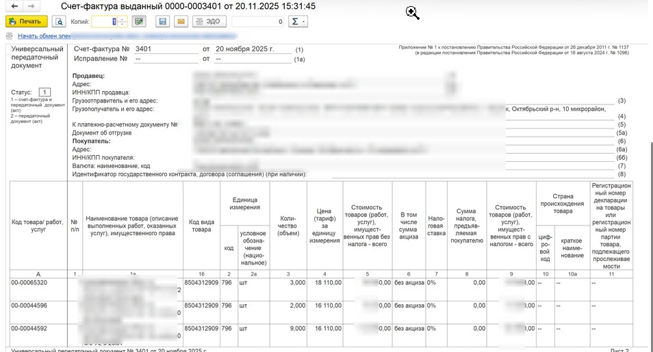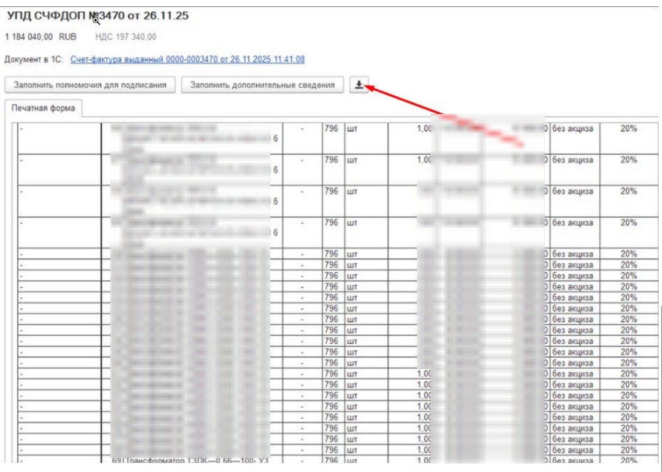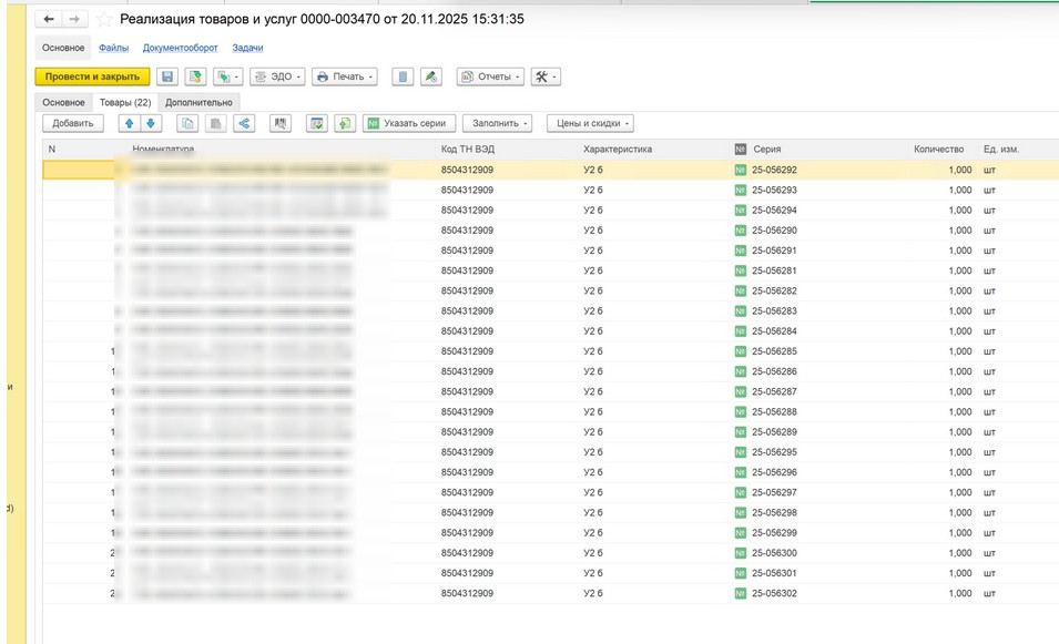 Требуется доработка через подключаемый модуль обработки диадок формирования УПД. Суть в том, что отгрузка в документе "Реализация" происходит по сериям, на каждую серию отдельная строка (см. рис.1). Нам нужно при формировании УПД сворачивать строки, т.к. как это делает печатная форма ( см. рис.2 и 3)
