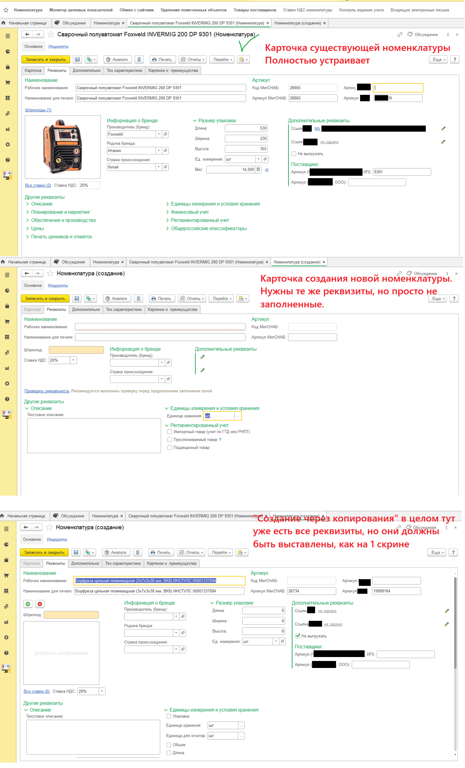 При открытии существующей карточки номенклатуры все отображается корректно. При создании новой номенклатуры много полей не отображены. Приложил скрин где визуально все показал.