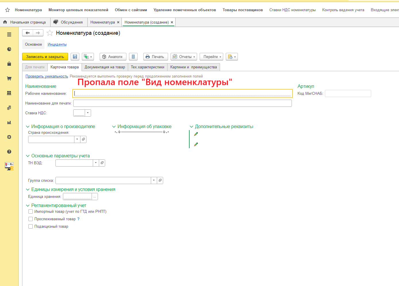 УТ 11.5 Пропало поле "Вид номенклатуры", при создании новой номенклатуры.