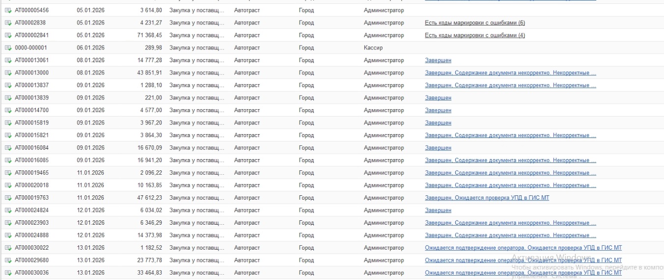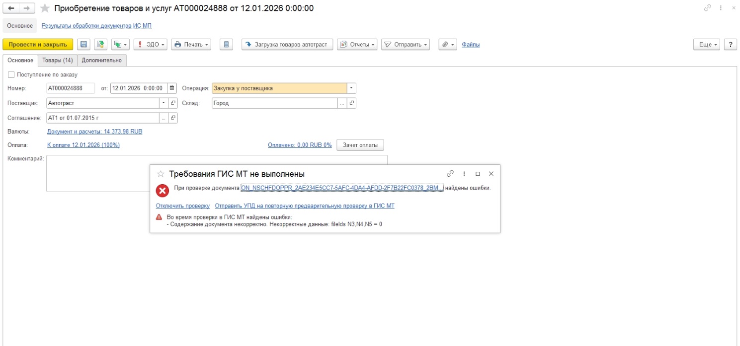 работаем по эдо... В документе "Приобретение товаров и услуг" Выходит сообщение "Требование гис мт не выполнено"