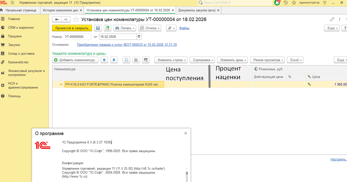 В УТ11 в документе установка цен нужно добавить колонку Процент наценки и Цену поступления. В программе есть вид цены Розничная цена. Она устанавливается при создании документа Установка цен на основании Приобретении товаров и услуг. В виде цен Розничная указана фиксированный процент наценки. Для определенных товаров этот процент должен быть другой. Чтобы вручную указать этот процент нужно в документе установка цен добавить колонку Процент наценки и Цену поступления. если фиксированный процент указанный в виде цен не подходит пользователь вручную меняет процент наценки на цену поступления. После этого Розничная цена должна пересчитаться.