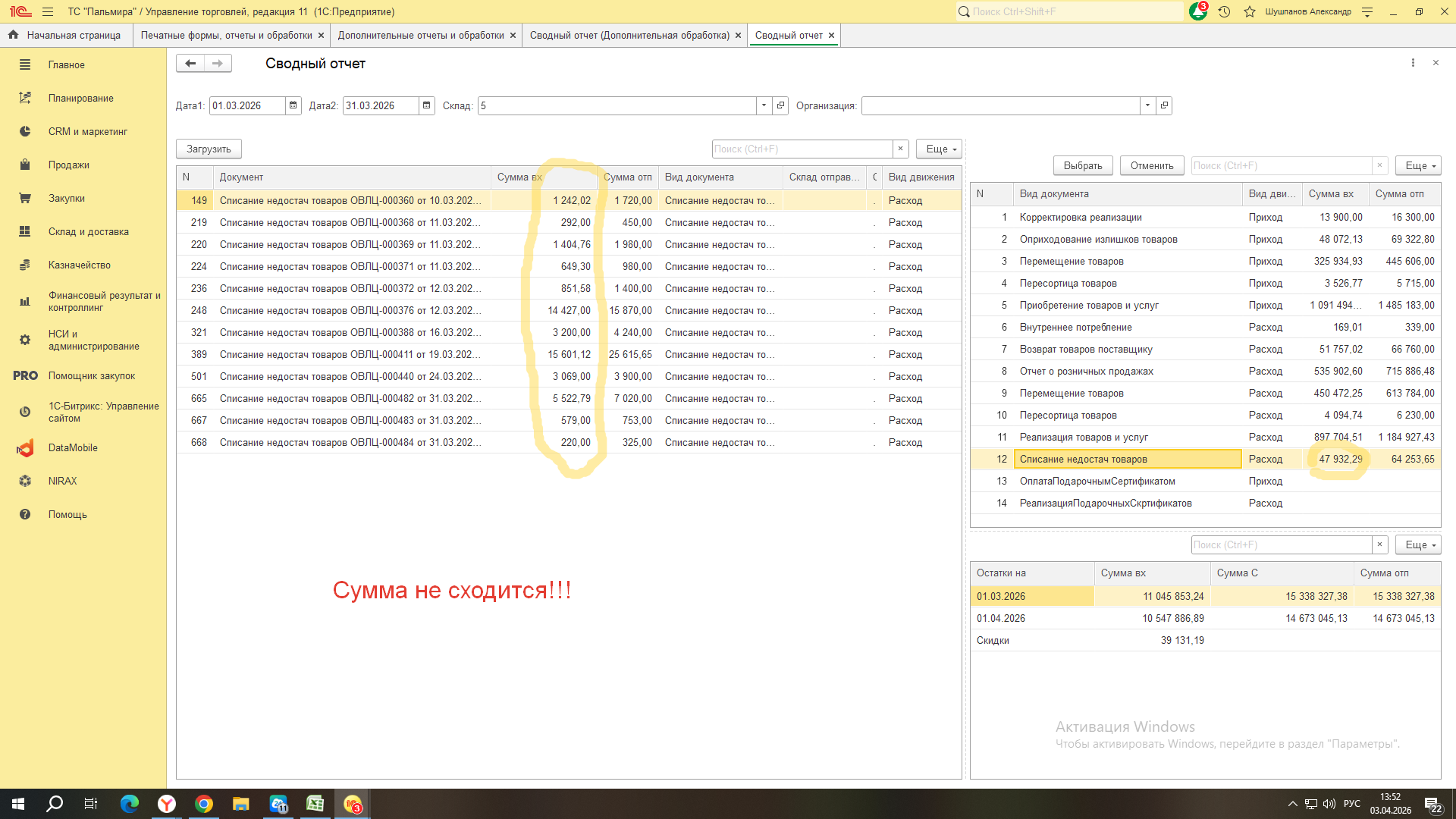 В "Сводном отчете" сумма в документах списания за период не совпадает с итоговой. Нужно разобраться.