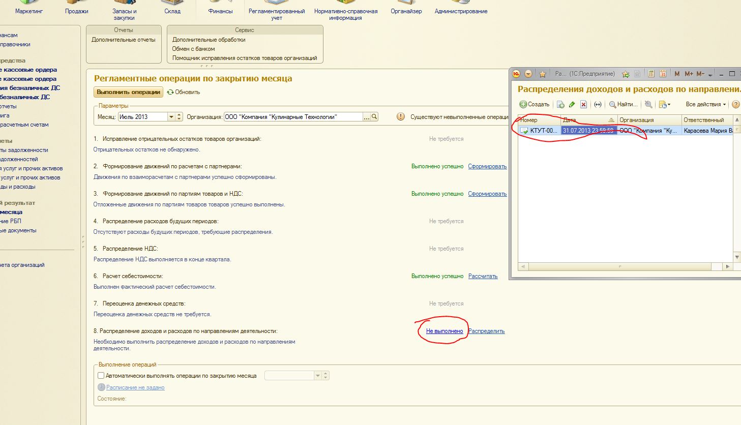 Не получается сделать распределение доходов и расходов по направлениям деятельности начиная с июля месяца. Документ есть, заполнен и проведен. Но в интерфейсе все равно пишет "не сформировано".