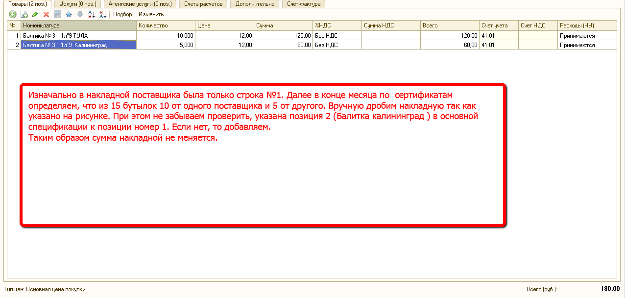 В течение отчетного периода все поступления ложатся на Номенклатуру №1. Далее бухгалтер в конце месяца дробит приходы. Поступление с Номенклатурой 1 превращается в приход с позициями