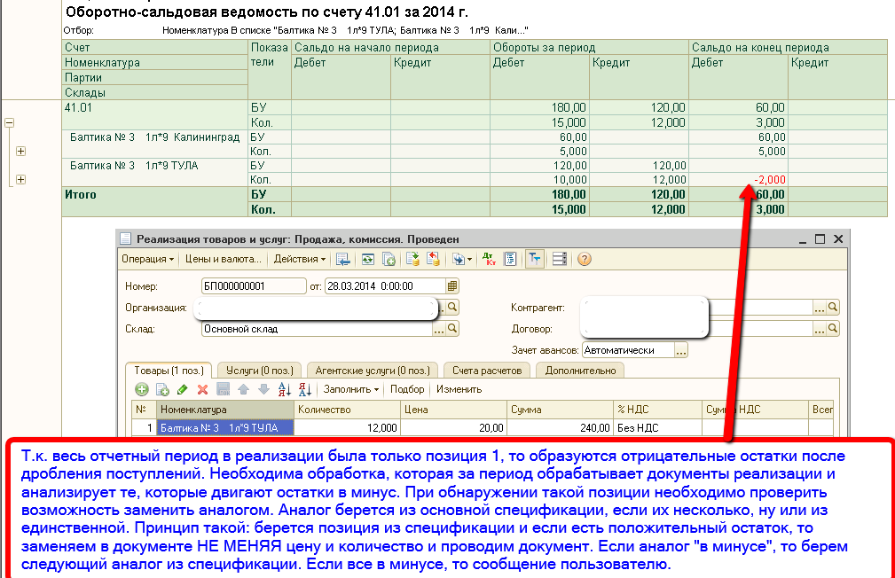 Вот с этого места необходима обработка, которая за период анализирует документы реализации и на предмет движения остатков в минус. При обнаружении такой позиции необходимо проверить возможность заменить аналогом. Аналог берется из основной спецификации, если их несколько, или из единственной. Принцип такой: берется позиция из спецификации и если есть положительный остаток, то заменяем в документе НЕ МЕНЯЯ цену и количество. Проводим документ. Если и аналог "в минусе", то сообщение пользователю.