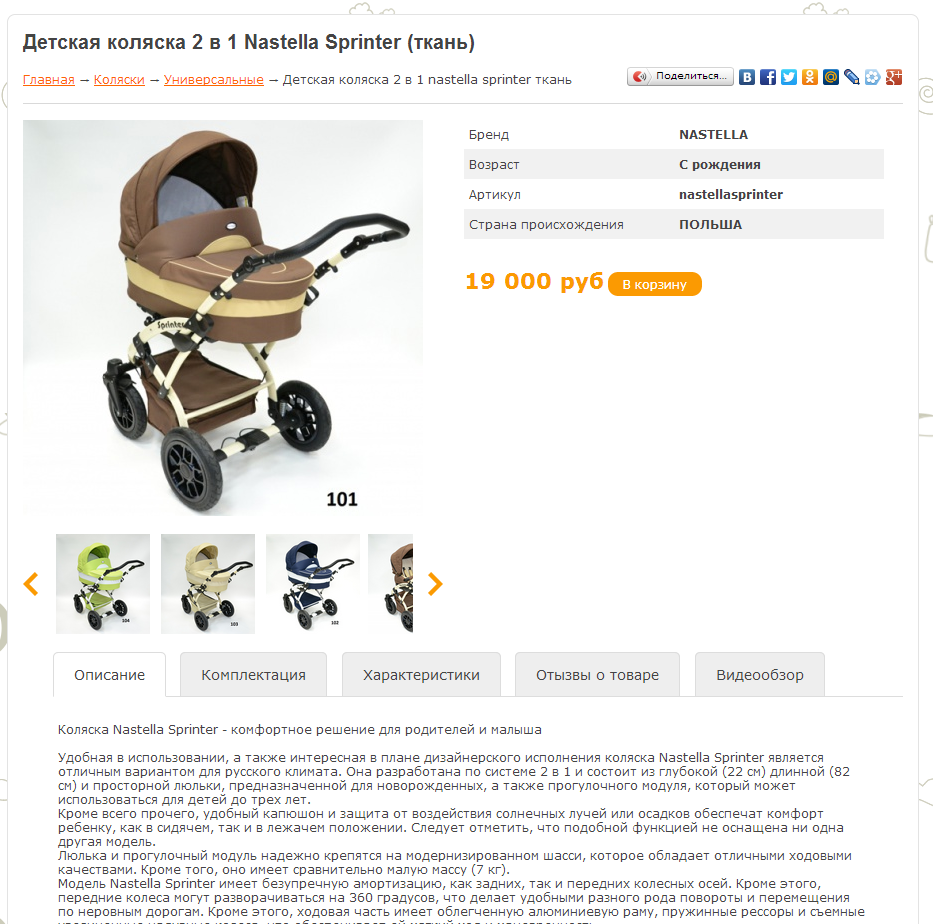 Мы дополнительно ввели три закладки в карточку, т.е. кроме стандартной закладки Описание добавили еще три закладки: Характеристики, Комплектация и Видеообзор.