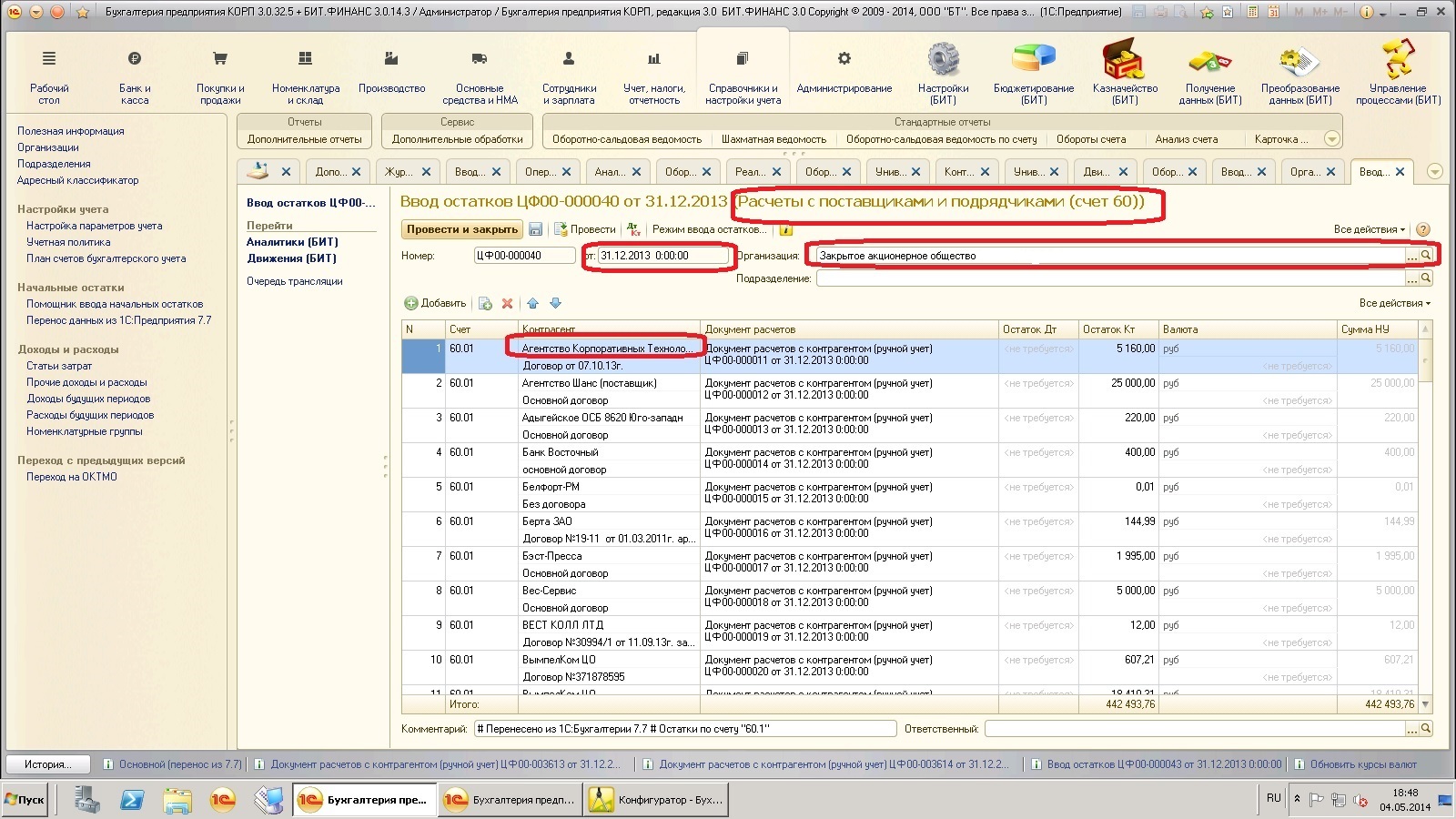 Пример Ввода остатков (исходный документ) по поставщикам и подрядчикам высылаю.