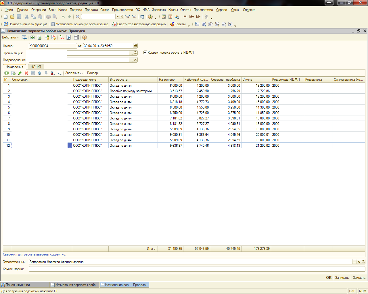 Задача: Изменить табличную часть (согласно рисунку - 1) и порядок заполнения начисления по з/п. Сделано нужно аналогично Бух. 2.0.
